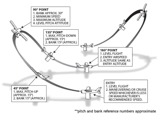 - 90° point -- maintain pitch -- reduce bank angle to attain level flight at 180° point 2nd 90° of turn, Pitch = constant 10--12° pitch up, Bank = decreasing to level flight